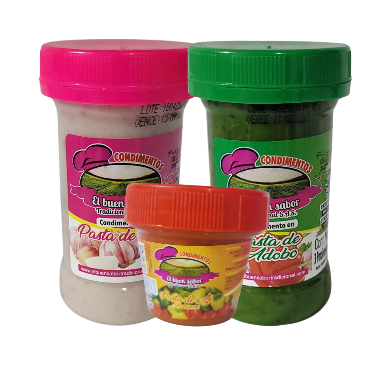 Combo de condimentos en pasta de la marca El Buen Sabor (ajo de 100gr, adobo de 100gr y ají de 50gr) tiene todo para ser potente y sabroso.